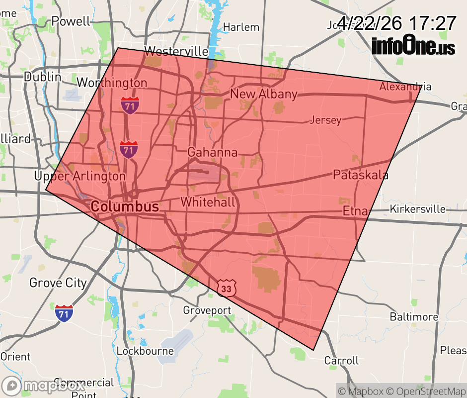 Canceled 4/22/26 5:49 PM Severe Thunderstorm Warning issued April 22 at 5:26PM EDT until April 22 at 6:15PM EDT by NWS Wilmington OH SVRILN The National Weather Service in Wilmington has issued a * Severe Thunderstorm Warning for... Northeastern Franklin County in central Ohio... Northwestern Fairfield County in central Ohio... Southwestern Licking County in central Ohio... * Until 615 PM EDT. * At 526 PM EDT, a severe thunderstorm was located over Minerva Park, moving east at 15 mph. HAZARD...60 mph wind gusts and quarter size hail. SOURCE...Radar indicated. IMPACT...Minor hail damage to vehicles is possible. Expect wind damage to trees and power lines. * Locations impacted include... Columbus, Westerville, Reynoldsburg, Upper Arlington, Gahanna, Pickerington, Worthington, Bexley, Pataskala, Canal Winchester, Groveport, Minerva Park, Ohio State University, Beechwood Trails, Easton, Summit Station, Whitehall, Etna, New Albany, and Grandview Heights. This includes the following Interstates... I-70 in Ohio between mile markers 95 and 119. I-71 in Ohio between mile markers 106 and 120. ![]() |