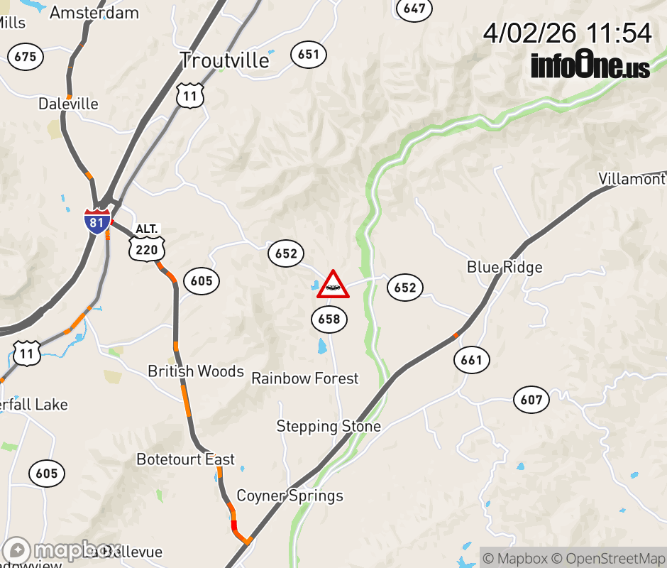 On Rt. 658 North in the County of Botetourt, in the vicinity of Mountain Pass Rd; Rt. 652E/W (Botetourt County), motorists can expect delays due to a vehicle crash. Lane closures exist. Updated: Thu 4/2/26 11:54 AM EDT ![]() Updated: Thu 4/2/26 11:54 AM EDT |