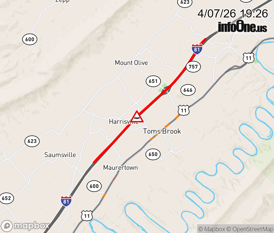 On I-81 South at mile marker 290.1 in the County of Shenandoah, motorists can expect delays due to a vehicle crash. Traffic backups are approximately 3.5 miles. Updated: Tue 4/7/26 7:26 PM EDT ![]() Updated: Tue 4/7/26 7:26 PM EDT |