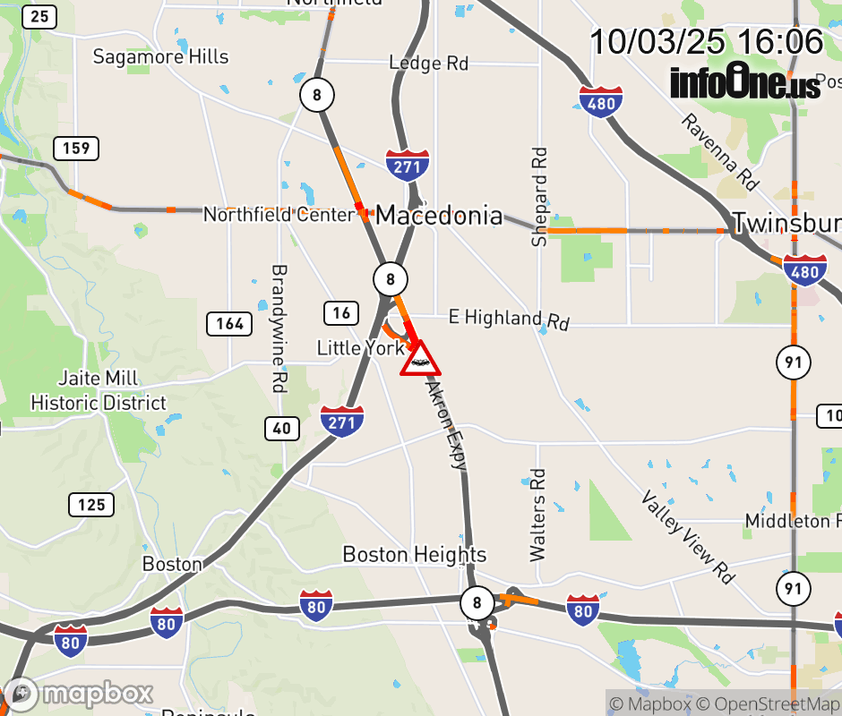 The 3 right lanes are blocked on Ramp I-271 South to SR-8 South, due to a crash. Updated: Fri 10/3/25 4:06 PM EDT ![]() Updated: Fri 10/3/25 4:06 PM EDT |