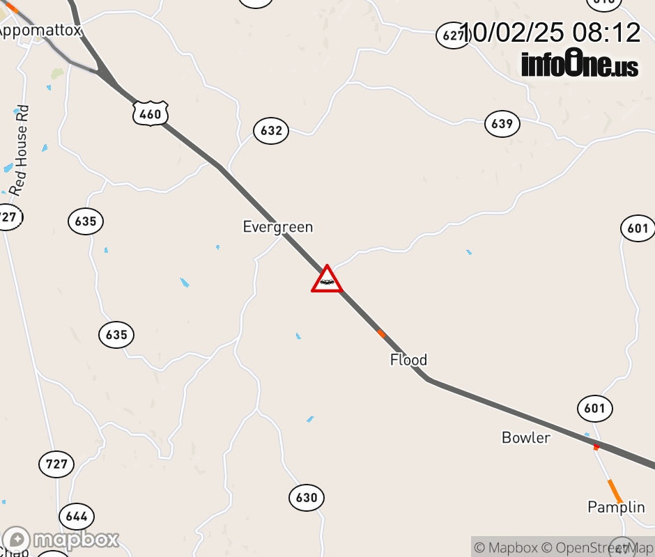 On US-460 in the County of Appomattox, in the vicinity of Spruce Dr; Rt. 633E/W (Appomattox County), motorists can expect delays due to a vehicle crash. The east right lane and right shoulder are closed. ![]() |
