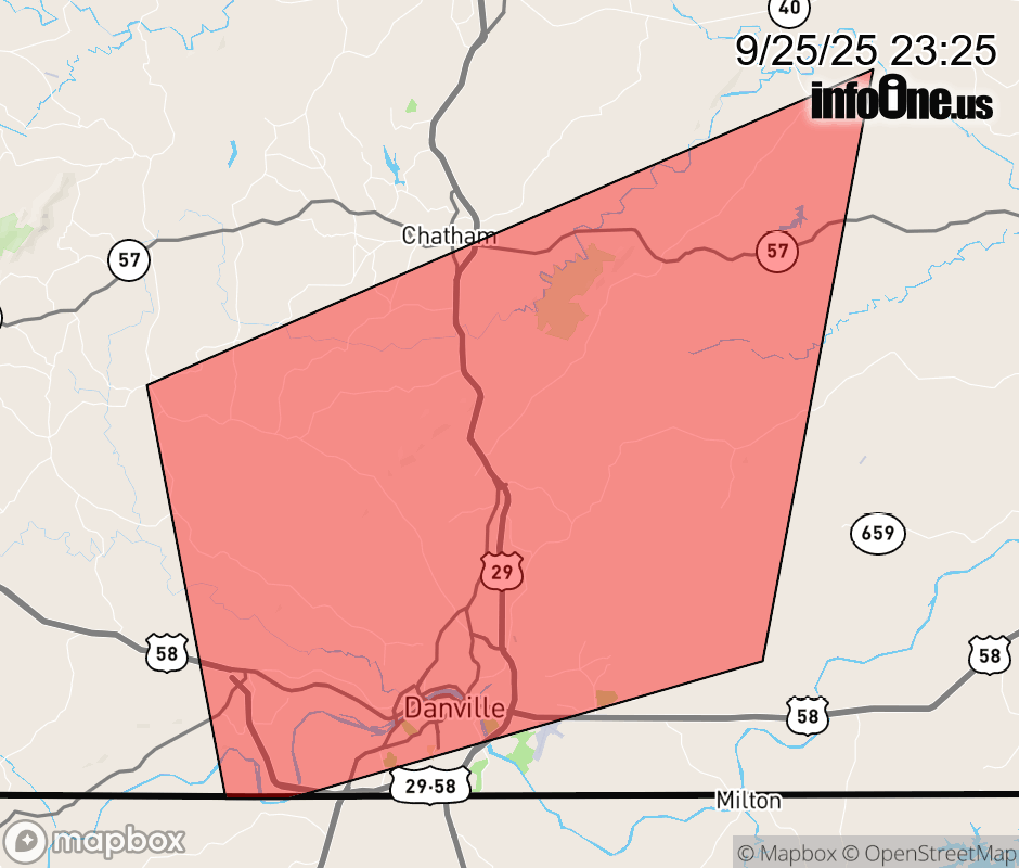 Canceled 9/26/25 12:00 AM Special Weather Statement issued September 25 at 11:24PM EDT by NWS Blacksburg VA At 1123 PM EDT, Doppler radar was tracking a strong thunderstorm near Blairs, moving northeast at 35 mph. HAZARD...Wind gusts up to 40 mph and pea size hail. SOURCE...Radar indicated. IMPACT...Gusty winds could knock down tree limbs and blow around unsecured objects. Locations impacted include... Danville... Chatham... Blairs... Java... Swansonville... Dry Fork... and Westover Hills. ![]() |
