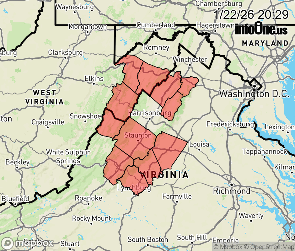 Cold Weather Advisory issued January 22 at 8:27PM EST until January 24 at 10:00AM EST by NWS Baltimore MD/Washington DC * WHAT... Very cold wind chills of 10 to 15 below expected. * WHERE... In Virginia, Central Virginia Blue Ridge, and Page, Shenandoah, Warren, Eastern Highland, and Western Highland Counties. In West Virginia, Eastern Grant, Eastern Pendleton, Hardy, and Western Pendleton Counties. * WHEN... From 8 PM Friday to 10 AM EST Saturday. * IMPACTS... The dangerously cold wind chills as low as 15 below zero could cause frostbite on exposed skin in as little as 30 minutes. ![]() |