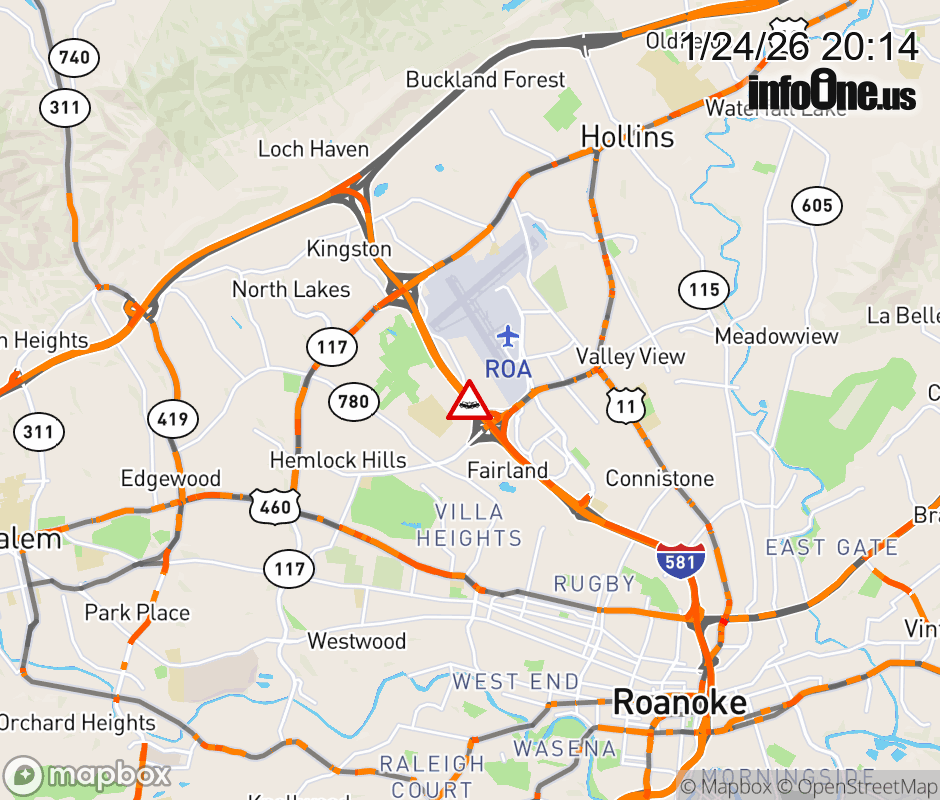 On I-581 at mile marker 4.3 in the City of Roanoke, motorists can expect delays due to a vehicle crash. The north left shoulder and left lane are closed. Updated: Sat 1/24/26 8:14 PM EST ![]() Updated: Sat 1/24/26 8:14 PM EST |