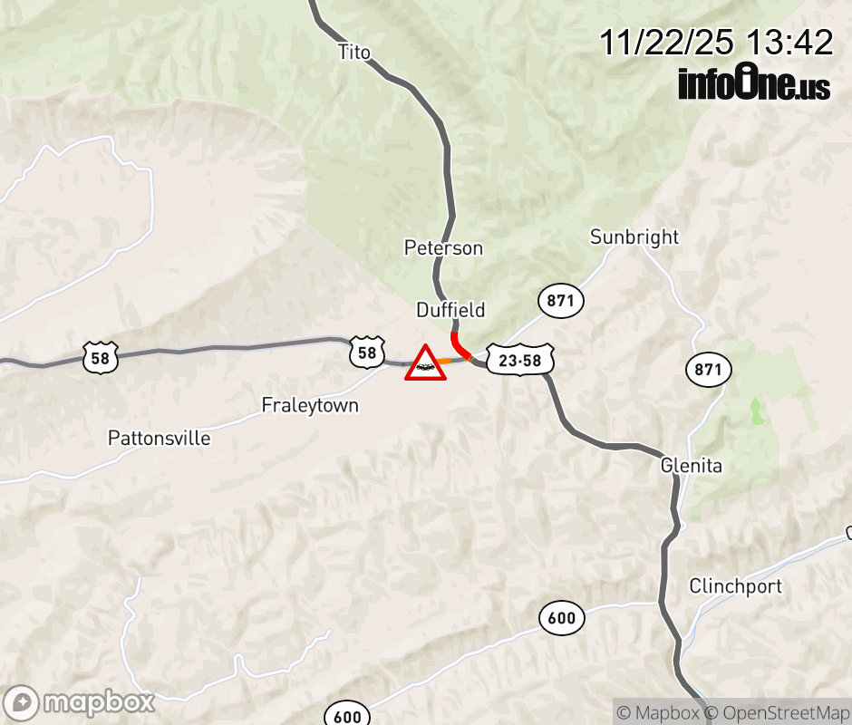 On US-58 in the County of Scott, in the vicinity of Boone Trail Rd; Rt. 772E/W (Scott County), motorists can expect delays due to a vehicle crash. The west left lane and right lane are closed. Updated: Sat 11/22/25 1:42 PM EST ![]() Updated: Sat 11/22/25 1:42 PM EST |