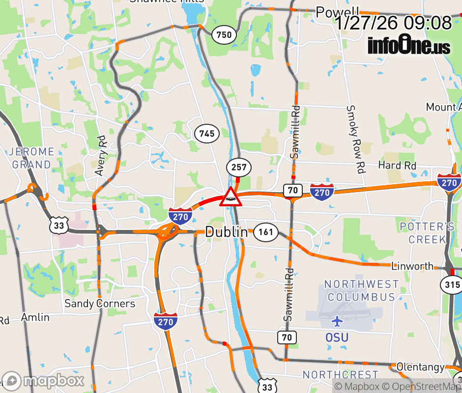 The right lane is blocked on I-270 East beyond US-33/SR-161, due to a crash. ![]() |