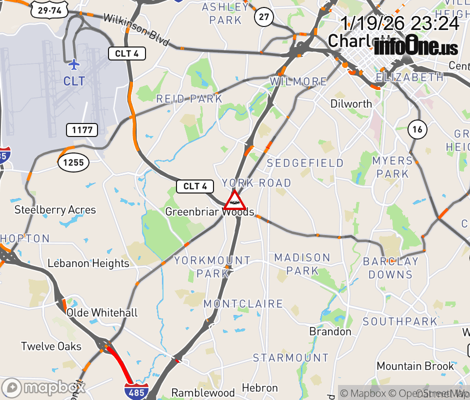 The right shoulder is closed near Exit 6 (S. Tryon St). Updated: Mon 1/19/26 11:24 PM EST ![]() Updated: Mon 1/19/26 11:24 PM EST |