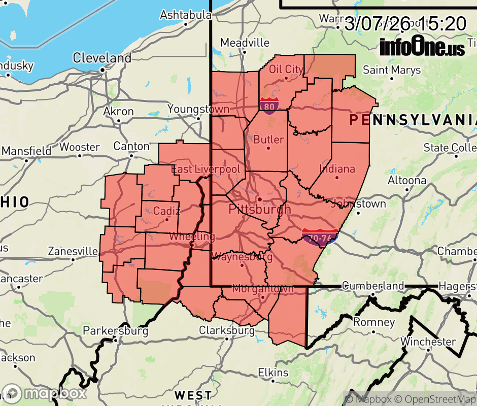 Canceled 3/7/26 3:45 PM Tornado Watch issued March 7 at 3:19PM EST until March 7 at 8:00PM EST by NWS Pittsburgh PA TORNADO WATCH 25 REMAINS VALID UNTIL 8 PM EST THIS EVENING FOR THE FOLLOWING AREAS IN OHIO THIS WATCH INCLUDES 9 COUNTIES IN EAST CENTRAL OHIO BELMONT CARROLL COLUMBIANA GUERNSEY HARRISON JEFFERSON OH MONROE NOBLE TUSCARAWAS IN PENNSYLVANIA THIS WATCH INCLUDES 15 COUNTIES IN NORTHWEST PENNSYLVANIA FOREST MERCER VENANGO IN SOUTHWEST PENNSYLVANIA ALLEGHENY FAYETTE GREENE WASHINGTON WESTMORELAND IN WEST CENTRAL PENNSYLVANIA ARMSTRONG BUTLER CLARION INDIANA JEFFERSON PA IN WESTERN PENNSYLVANIA BEAVER LAWRENCE IN WEST VIRGINIA THIS WATCH INCLUDES 8 COUNTIES IN NORTHEAST WEST VIRGINIA PRESTON IN NORTHERN WEST VIRGINIA MARION MONONGALIA WETZEL IN THE NORTHERN PANHANDLE OF WEST VIRGINIA BROOKE HANCOCK MARSHALL OHIO THIS INCLUDES THE CITIES OF ALIQUIPPA, AMBRIDGE, BEAVER FALLS, BROOKVILLE, BUTLER, CADIZ, CALDWELL, CAMBRIDGE, CANONSBURG, CARROLLTON, CLARION, COLUMBIANA, CONNELLSVILLE, DOVER, EAST LIVERPOOL, ELLWOOD CITY, FAIRMONT, FOLLANSBEE, FORD CITY, FRANKLIN, GREENSBURG, GROVE CITY, HERMITAGE, INDIANA, KINGWOOD, KITTANNING, LATROBE, MARTINS FERRY, MASONTOWN, MONACA, MORGANTOWN, MOUNDSVILLE, MURRYSVILLE, NEW CASTLE, NEW KENSINGTON, NEW MARTINSVILLE, NEW PHILADELPHIA, OIL CITY, PITTSBURGH METRO AREA, PUNXSUTAWNEY, SALEM, SHARON, ST. CLAIRSVILLE, STEUBENVILLE, TERRA ALTA, TIONESTA, UNIONTOWN, WASHINGTON, WAYNESBURG, WEIRTON, WELLSBURG, WHEELING, AND WOODSFIELD. ![]() |
