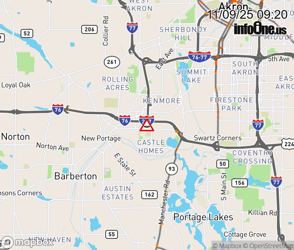 The right shoulder is closed on Ramp I-76/US224 East to I-76 East, due to a crash. Updated: Sun 11/9/25 9:20 AM EST ![]() Updated: Sun 11/9/25 9:20 AM EST |