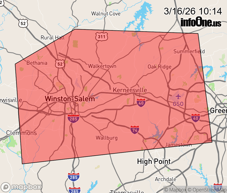 Canceled 3/16/26 10:28 AM Tornado Warning issued March 16 at 10:13AM EDT until March 16 at 10:45AM EDT by NWS Raleigh NC TORRAH The National Weather Service in Raleigh has issued a * Tornado Warning for... Forsyth County in central North Carolina... Northeastern Davidson County in central North Carolina... Northwestern Guilford County in central North Carolina... * Until 1045 AM EDT. * At 1013 AM EDT, a severe thunderstorm capable of producing a tornado was located near Winston-Salem, moving northeast at 55 mph. HAZARD...Tornado. SOURCE...Radar indicated rotation. IMPACT...Flying debris will be dangerous to those caught without shelter. Mobile homes will be damaged or destroyed. Damage to roofs, windows, and vehicles will occur. Tree damage is likely. * This dangerous storm will be near... Winston-Salem and Kernersville around 1020 AM EDT. Greensboro around 1030 AM EDT. Other locations impacted by this tornadic thunderstorm include Pfafftown, Stokesdale, Summerfield, Oak Hollow Marina, and Belews Creek. This includes the following highways... Interstate 85 Mile Marker 33 and near Mile Marker 120. Interstate 40 between Mile Markers 184 and 216. Interstate 73 between Mile Markers 97 and 103. Interstate 74 between Mile Markers 56 and 69. ![]() |