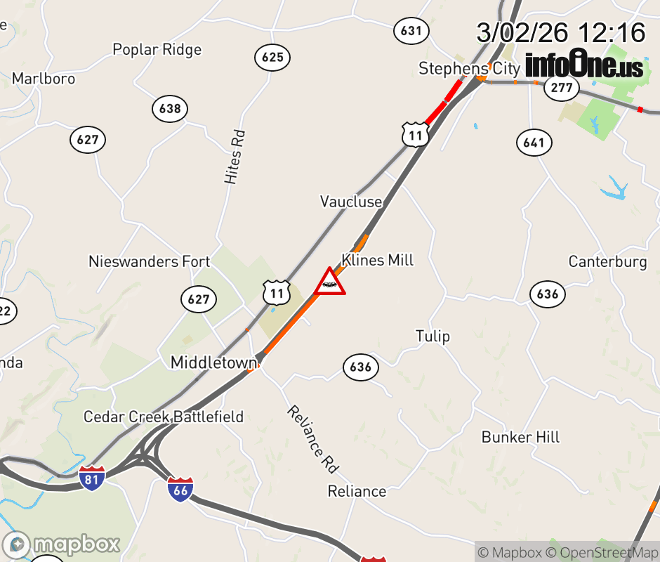 On I-81 North at mile marker 303.8 in the County of Frederick, motorists can expect delays due to a tractor trailer crash. Traffic backups are approximately 2.5 miles. Updated: Mon 3/2/26 12:16 PM EST ![]() Updated: Mon 3/2/26 12:16 PM EST |