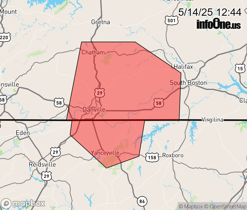 Canceled 5/14/25 1:13 PM Severe Thunderstorm Warning issued May 14 at 12:43PM EDT until May 14 at 1:45PM EDT by NWS Blacksburg VA SVRRNK The National Weather Service in BLACKSBURG has issued a * Severe Thunderstorm Warning for... Northern Caswell County in north central North Carolina... The City of Danville in south central Virginia... Southeastern Pittsylvania County in south central Virginia... Southwestern Halifax County in south central Virginia... * Until 145 PM EDT. * At 1242 PM EDT, a severe thunderstorm was located over Providence, moving northeast at 25 mph. HAZARD...60 mph wind gusts and quarter size hail. SOURCE...Radar indicated. IMPACT...Hail damage to vehicles is expected. Expect wind damage to roofs, siding, and trees. * Locations impacted include... Danville... South Boston... Yanceyville... Bethel... Chatham... Turbeville... and Ingram. ![]() |