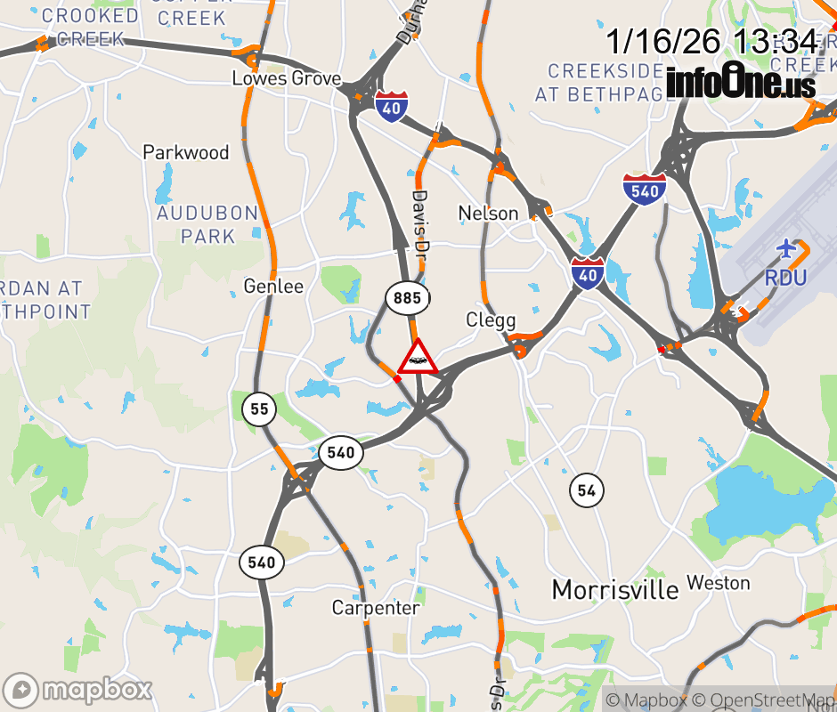 The right lane is closed past Exit 67 (NC 885 Toll) Updated: Fri 1/16/26 1:34 PM EST ![]() Updated: Fri 1/16/26 1:34 PM EST |