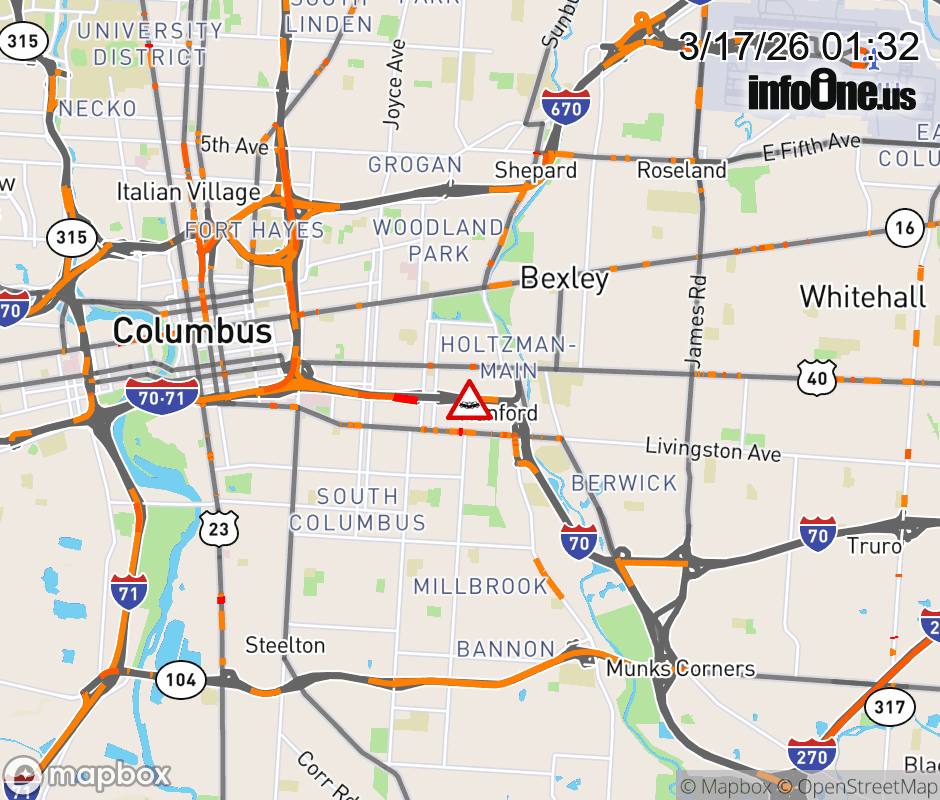The 2 right lanes are closed on I-70 East beyond Miller Ave/Kelton Ave, due to a crash. Updated: Tue 3/17/26 1:32 AM EDT ![]() Updated: Tue 3/17/26 1:32 AM EDT |