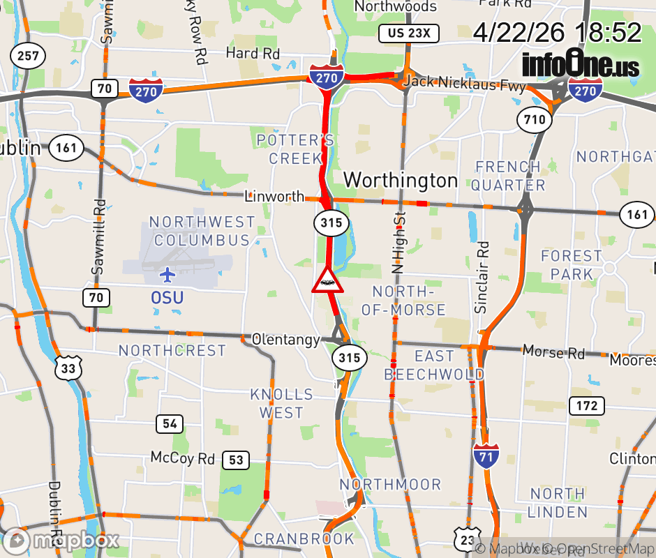 The right shoulder is closed on SR-315 South beyond SR-161, due to a crash. Updated: Wed 4/22/26 6:52 PM EDT ![]() Updated: Wed 4/22/26 6:52 PM EDT |