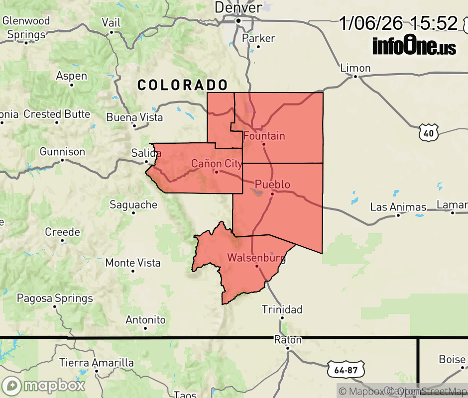 Canceled 1/6/26 5:00 PM Red Flag Warning issued January 6 at 1:49PM MST until January 6 at 5:00PM MST by NWS Pueblo CO * AFFECTED AREA... Fire Weather Zones 221, 222, 226, 227, 228 and 229. * WINDS... Southwest 15 to 25 mph with gusts up to 40 mph. * RELATIVE HUMIDITY... As low as 12 percent. * IMPACTS... Fires will catch and spread quickly. Exercise extreme caution with any outdoor burning. ![]() |