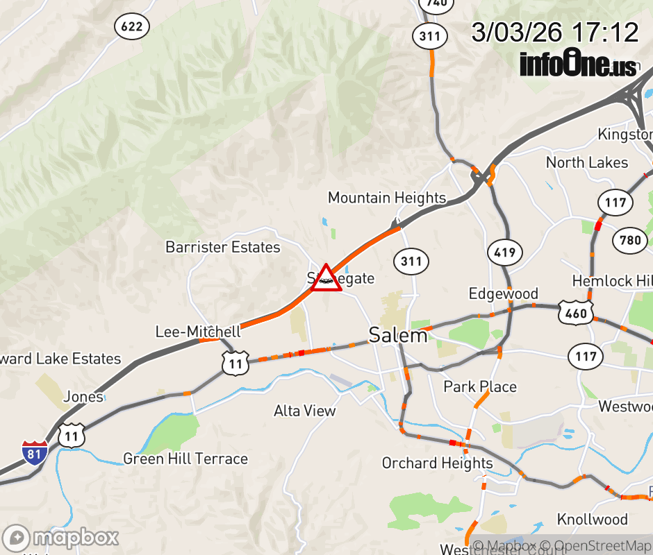 On I-81 at mile marker 138.9 in the County of Roanoke, motorists can expect delays due to a vehicle crash. The north right shoulder is closed. ![]() |