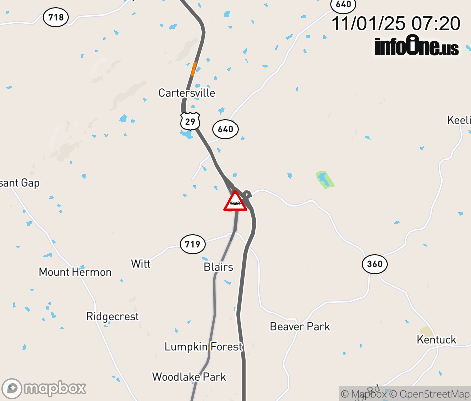 On BUS US-29 North in the County of Pittsylvania, in the vicinity of Malmaison Rd; Rt. 726N (Pittsylvania County), motorists can expect delays due to a vehicle crash. Lane closures exist. ![]() |