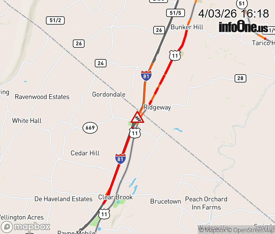 On I-81 North at mile marker 324 in the County of Frederick, motorists can expect delays due to congestion. Updated: Fri 4/3/26 4:18 PM EDT ![]() Updated: Fri 4/3/26 4:18 PM EDT |