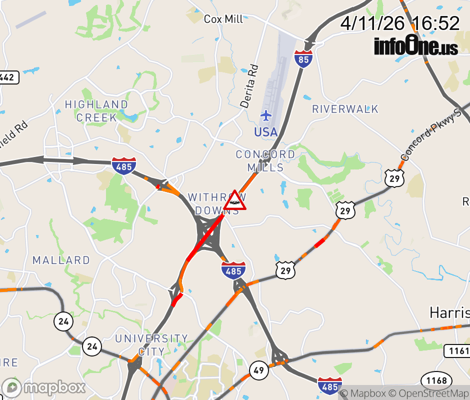 The right lane is closed after Exit 48 (I-485). Updated: Sat 4/11/26 4:52 PM EDT ![]() Updated: Sat 4/11/26 4:52 PM EDT |