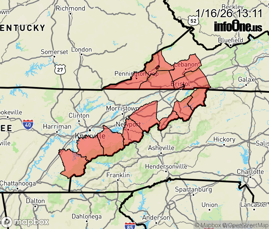 Canceled 1/17/26 1:00 AM Special Weather Statement issued January 16 at 1:09PM EST by NWS Morristown TN A cold front will swing across region bringing increasing precipitation chances late tonight through Saturday morning. Precipitation is expected to be rain or a rain snow mix at onset, but periods of light to moderate snow showers will lead to a quick 1 to 2 inches of accumulation as temperatures approach near or just below freezing. Most likely locations to receive this light accumulation will be elevations between 2000 and 4000 feet. Highest mountain peaks could see isolated totals near 3 inches. ![]() |