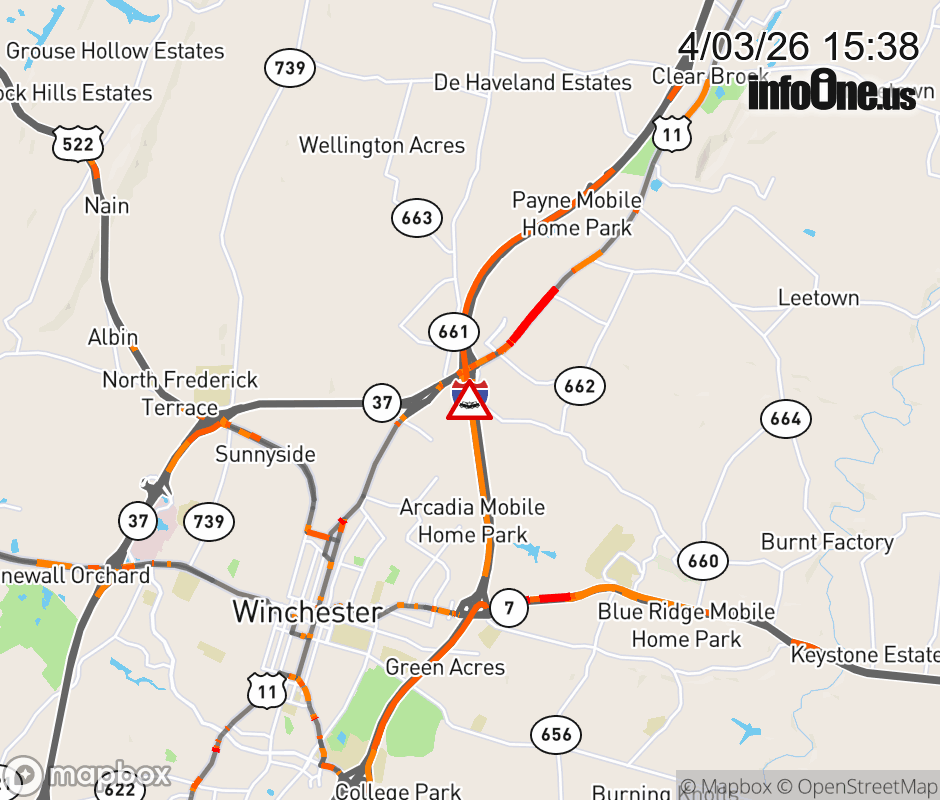 On I-81 South at mile marker 317.5 in the County of Frederick, motorists can expect delays due to a vehicle crash. Traffic backups are approximately 2.5 miles. Updated: Fri 4/3/26 3:38 PM EDT ![]() Updated: Fri 4/3/26 3:38 PM EDT |