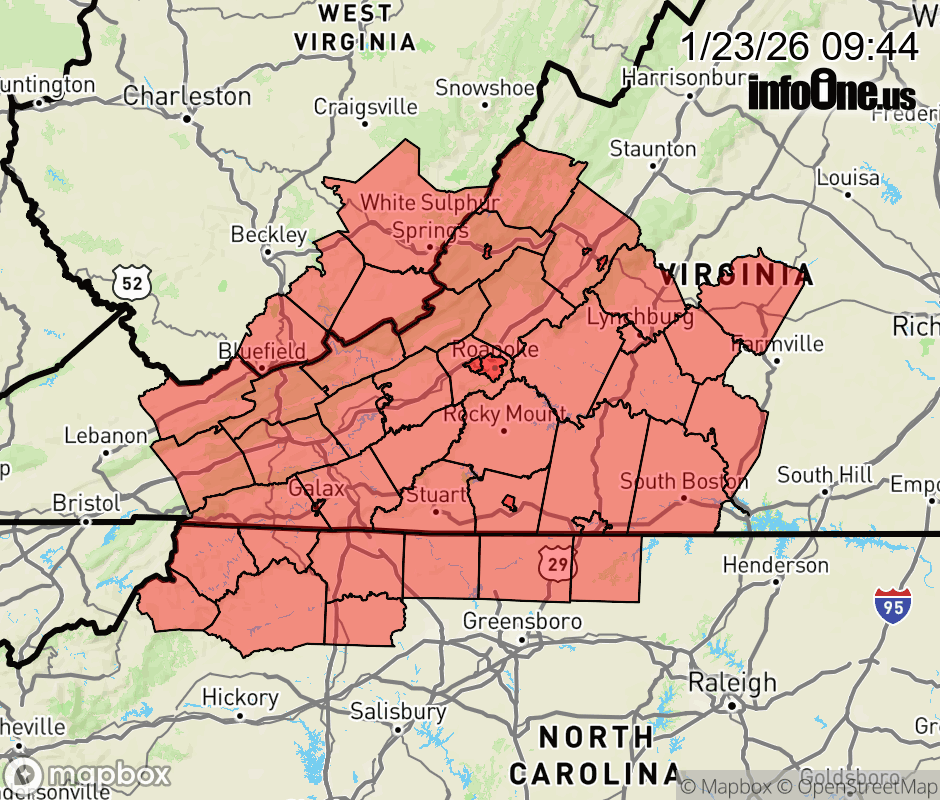 Winter Storm Warning issued January 23 at 9:43AM EST until January 26 at 1:00PM EST by NWS Blacksburg VA * WHAT... Heavy mixed precipitation. Mainly snow and possibly sleet along and north of U.S. 460, and snow, sleet and freezing rain south of U.S. 460. * WHERE... Portions of north central and northwest North Carolina, central, south central, southwest, and west central Virginia, and southeast West Virginia. * WHEN... From 1 PM Saturday to 1 PM EST Monday. * IMPACTS... Power outages and tree damage are likely due to the ice. Travel could be nearly impossible. The hazardous conditions could impact the Monday morning commute. ![]() |
