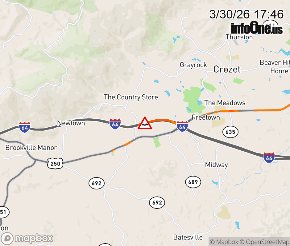 On I-64 at mile marker 106.2 in the County of Albemarle, motorists can expect delays due to a vehicle crash. The west right shoulder is closed. Updated: Mon 3/30/26 5:46 PM EDT ![]() Updated: Mon 3/30/26 5:46 PM EDT |