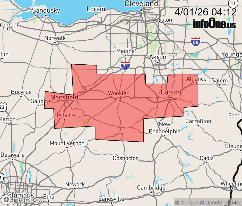 Canceled 4/1/26 9:55 AM Flood Warning issued April 1 at 4:11AM EDT until April 1 at 10:00AM EDT by NWS Cleveland OH * WHAT... Flooding caused by excessive rainfall is expected. * WHERE... Portions of north central and northeast Ohio, including the following counties, in north central Ohio, Ashland and Richland. In northeast Ohio, Holmes, Stark and Wayne. * WHEN... Until 1000 AM EDT. * IMPACTS... Flooding of rivers, creeks, streams, and other low-lying and flood-prone locations is imminent or occurring. Significant rises are ongoing or expected along the branches of the Mohican River, branches of the Nimishillen Creek, and the Killbuck Creek and tributaries into these larger creeks and rivers. * ADDITIONAL DETAILS... - At 409 AM EDT, Doppler radar and automated rain gauges indicated heavy rain due to thunderstorms. Flooding is ongoing or expected to begin shortly in the warned area. Between 0.5 and 2 inches of rain have fallen. - Additional rainfall amounts up to 1 inch are possible in the warned area. - Some locations that will experience flooding include... Canton, Mansfield, Wooster, Ashland, Millersburg, Massillon, Green, Alliance, North Canton, Louisville, Orrville, Berlin, Rittman, Ontario, Lexington, Crestline, Walnut Creek, Minerva, Doylestown and Hartville. - Please visit www.weather.gov/safety/flood for flood safety and preparedness information. ![]() |