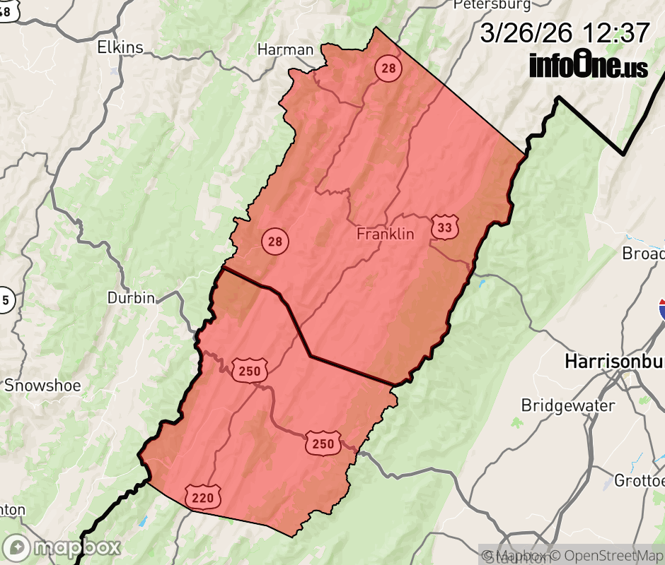 Canceled 3/26/26 8:12 PM Wind Advisory issued March 26 at 12:36PM EDT until March 27 at 7:00AM EDT by NWS Baltimore MD/Washington DC * WHAT... West winds 15 to 25 mph with gusts up to 50 mph expected. * WHERE... In Virginia, Western Highland County. In West Virginia, Western Pendleton County. * WHEN... From 11 PM this evening to 7 AM EDT Friday. * IMPACTS... Gusty winds will blow around unsecured objects. Tree limbs could be blown down and a few power outages may result. ![]() |