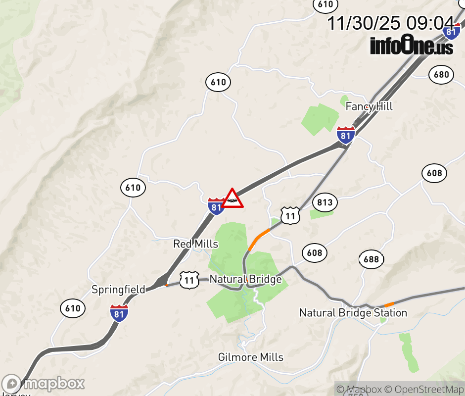 On I-81 at mile marker 178 in the County of Rockbridge, motorists can expect delays due to a tractor trailer crash. The north right lane and right shoulder are closed. Updated: Sun 11/30/25 9:04 AM EST ![]() |