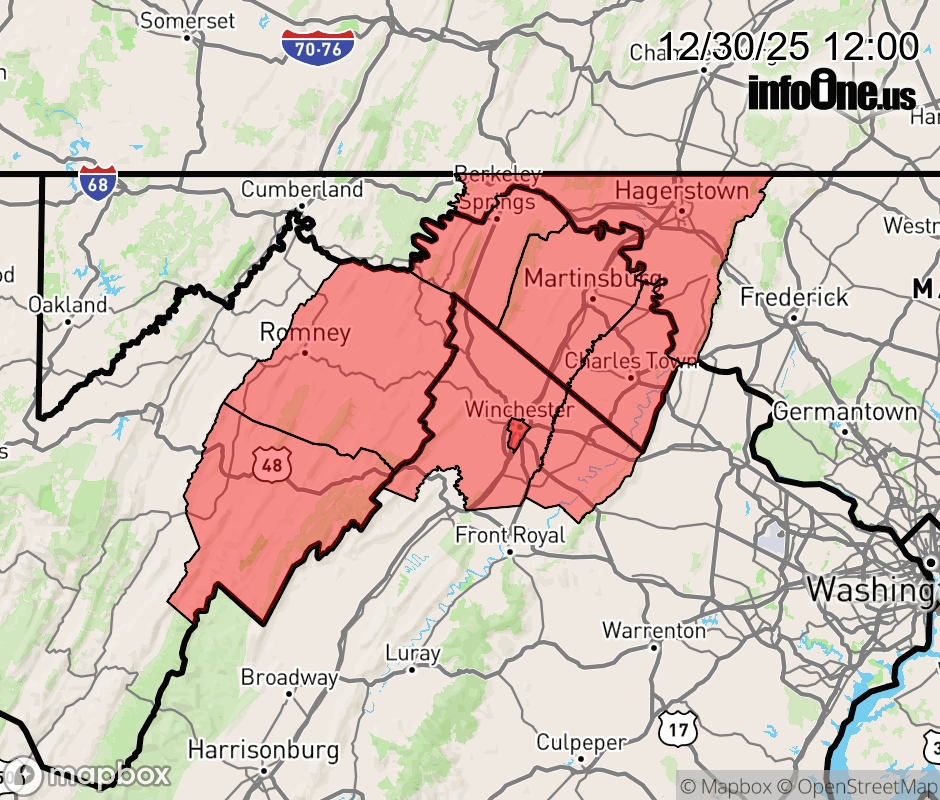 Canceled 12/30/25 1:22 PM Wind Advisory issued December 30 at 11:59AM EST until December 30 at 4:00PM EST by NWS Baltimore MD/Washington DC * WHAT... West winds 15 to 25 mph with gusts up to 50 mph. * WHERE... In Maryland, Washington County. In Virginia, Clarke and Frederick VA Counties. In West Virginia, Hampshire, Hardy, Berkeley, Jefferson, and Morgan Counties. * WHEN... Until 4 PM EST this afternoon. * IMPACTS... Gusty winds will blow around unsecured objects. Tree limbs could be blown down and a few power outages may result. ![]() |