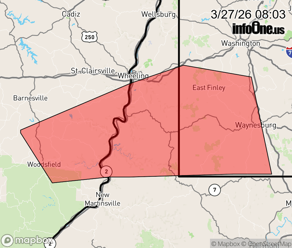 Canceled 3/27/26 10:17 AM Flood Warning issued March 27 at 8:02AM EDT until March 27 at 10:30AM EDT by NWS Pittsburgh PA * WHAT... Flooding caused by excessive rainfall continues. * WHERE... Southern Belmont County in east central Ohio... Northeastern Monroe County in east central Ohio... Greene County in southwestern Pennsylvania... Southwestern Washington County in southwestern Pennsylvania... Marshall County in northern West Virginia... Ohio County in northern West Virginia... * WHEN... Until 1030 AM EDT. * IMPACTS... Flooding of rivers, creeks, streams, and other low-lying and flood-prone locations is imminent or occurring. * ADDITIONAL DETAILS... - At 800 AM EDT, Doppler radar, automated rain gauges, and DOT reports indicated an area of very heavy rainfall across the warned area. Between 1 and 1.5 inches of rain have fallen. - Some locations that will experience flooding include... Wheeling, Moundsville, Bellaire, Waynesburg, Bethlehem, Woodsfield, Triadelphia, Shadyside, McMechen, Powhatan Point, Glen Dale, Cameron, Benwood, Rogersville, West Finley, Beallsville, Clarington, Aleppo and Jerusalem. - http://www.weather.gov/safety/flood ![]() |