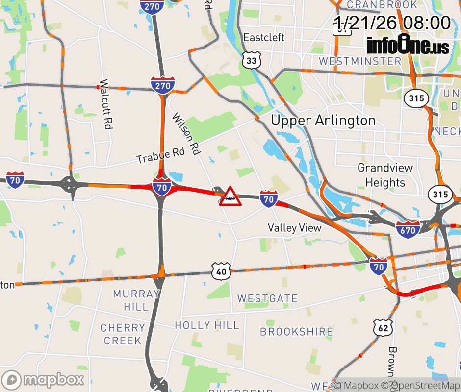 The left shoulder is blocked on I-70 East beyond Wilson Rd, due to a crash. Updated: Wed 1/21/26 8:00 AM EST ![]() Updated: Wed 1/21/26 8:00 AM EST |