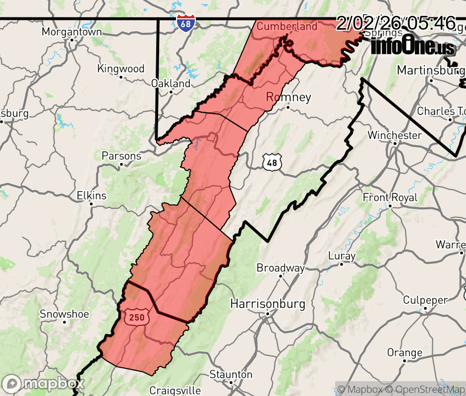 Canceled 2/2/26 8:48 AM Cold Weather Advisory issued February 2 at 5:45AM EST until February 2 at 10:00AM EST by NWS Baltimore MD/Washington DC * WHAT... Very cold wind chills as low as 16 below. * WHERE... In Maryland, Eastern Garrett, Extreme Western Allegany, and Western Garrett Counties. In Virginia, Western Highland County. In West Virginia, Western Grant, Western Mineral, and Western Pendleton Counties. * WHEN... Until 10 AM EST this morning. * IMPACTS... The cold wind chills as low as 15 below zero could result in hypothermia or frostbite if precautions are not taken. Frostbite and hypothermia will occur if unprotected skin is exposed to these temperatures. Wind chill values can lead to hypothermia with prolonged exposure. ![]() |