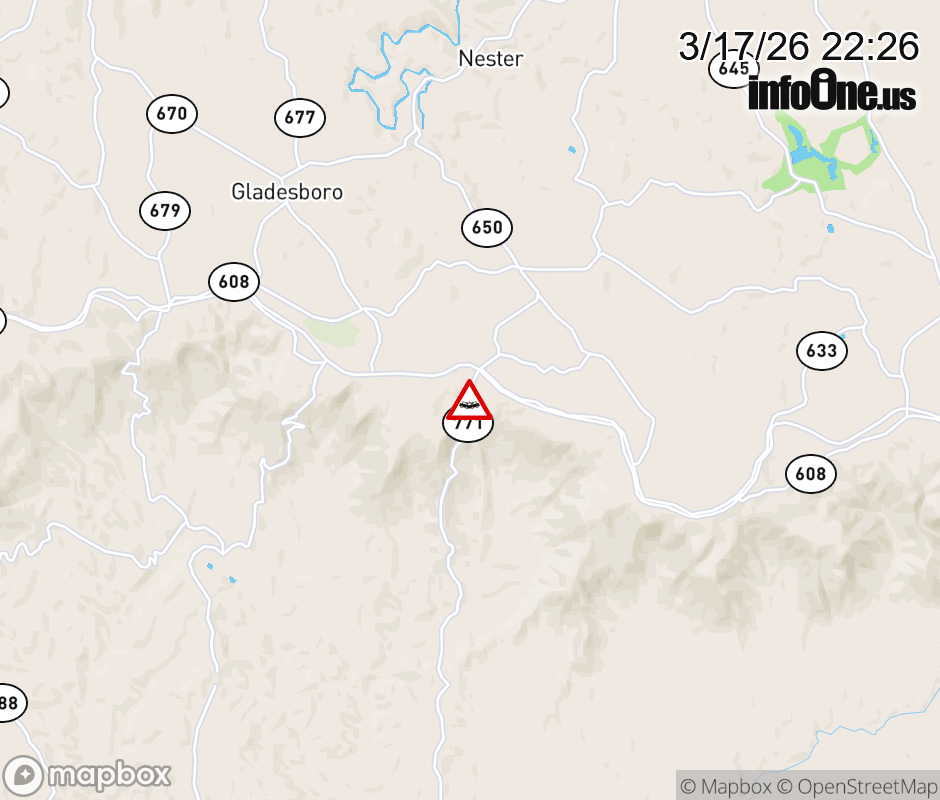 On Rt. 771 in the County of Patrick, in the vicinity of Blue Ridge Pkwy; Bluemont Ln; Boundary Rd; Groundhog Mtn Rd; Willis Gap Rd; Rt. 648N/S (Carroll County); Rt. 608E/W (Carroll County); VA-48N/S, motorists can expect delays due to a vehicle crash. All north lanes are closed. All south lanes are closed. Updated: Tue 3/17/26 10:26 PM EDT ![]() Updated: Tue 3/17/26 10:26 PM EDT |