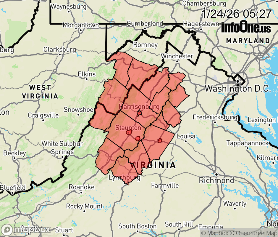 Canceled 1/24/26 1:17 PM Winter Storm Warning issued January 24 at 5:26AM EST until January 26 at 1:00AM EST by NWS Baltimore MD/Washington DC ...MAJOR WINTER STORM WILL IMPACT THE REGION THIS EVENING THROUGH SUNDAY EVENING... .A large area of precipitation will overrun Arctic air in place over the Mid-Atlantic. This will lead to widespread significant snow beginning this evening, with the potential for ice Sunday especially south of Highway 50 and near and east of Interstate 95. In addition to the high threat for significant snow and ice, very cold temperatures are expected tonight through the middle of next week with sub-zero wind chills likely at times. * WHAT... Heavy mixed precipitation expected. Total snow and sleet accumulations between 8 and 14 inches, with highest amounts west of the Blue Ridge and especially into eastern WV. Ice accumulations of one to two tenths, mainly south of US-33, and up to one quarter inch of ice accumulation is possible along the Blue Ridge. * WHERE... Portions of central, northwest, and western Virginia and eastern West Virginia. * WHEN... From 7 PM this evening to 1 AM EST Monday. * IMPACTS... Power outages and tree damage are likely due to the ice. Travel could be nearly impossible. * ADDITIONAL DETAILS... Snow will likely overspread the area by tonight, becoming heavy at times with rates of one to two inches per hour possible at times. A mix with sleet or freezing rain is expected Sunday, especially south of Interstate 70. Significant icing is possible especially across central Virginia. Visibility of one-quarter mile or less is possible at times. A prolonged period of wind chills in the teens and single digits continues this evening and lasting through the middle of next week, with sub-zero wind chills possible at times. ![]() |