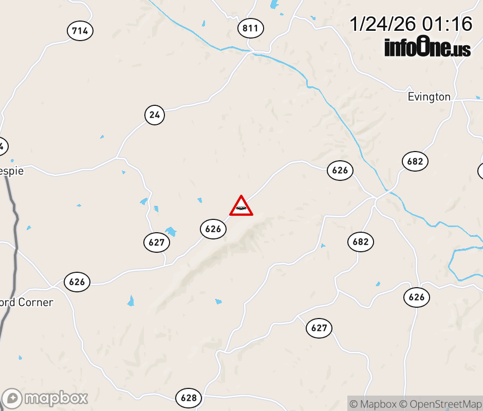 On Rt. 626 North in the County of Bedford, in the vicinity of Orrix Creek Rd; Rt. 713E/W (Bedford County), motorists can expect delays due to a vehicle crash. Lane closures exist. ![]() |