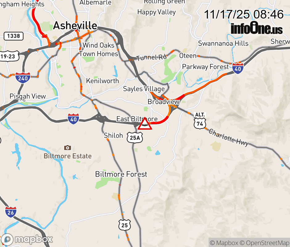 The right shoulder is closed near Exit 51, US 25 Alternate (Sweeten Creek Road). Updated: Mon 11/17/25 8:46 AM EST ![]() Updated: Mon 11/17/25 8:46 AM EST |
