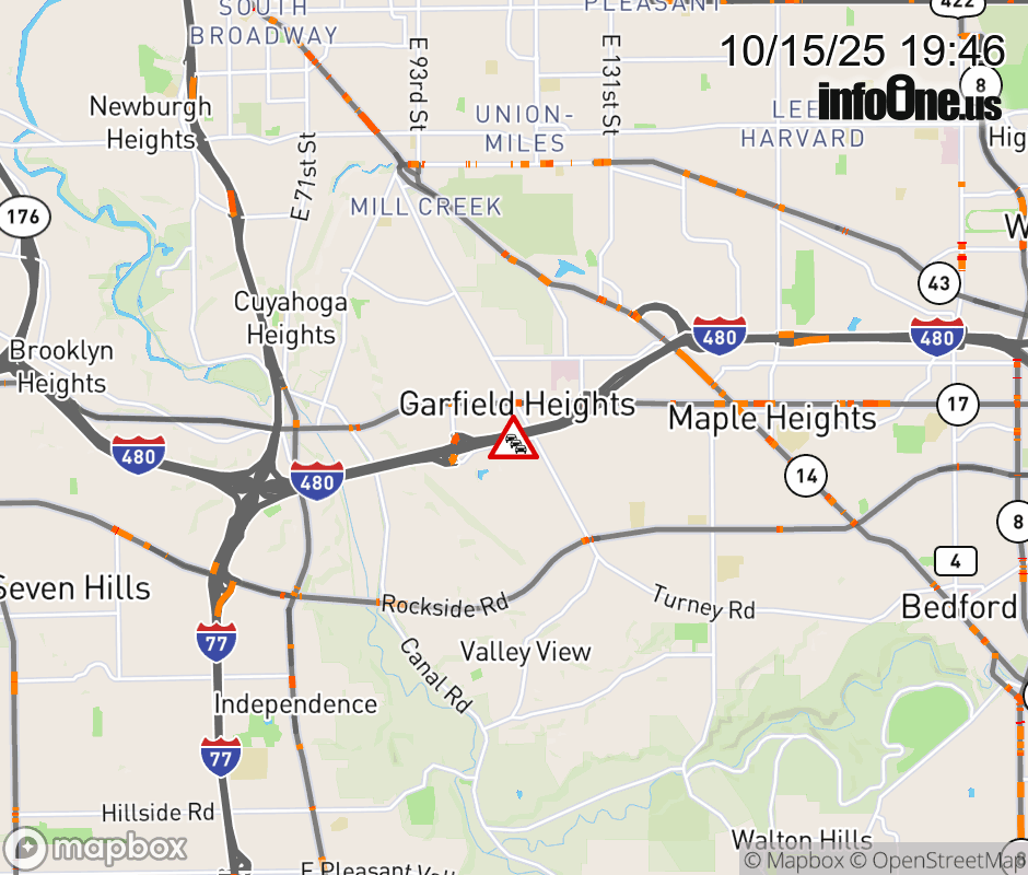 The right lane is blocked on I-480 East beyond Transportation Blvd/E 98th St, due to repairs/maintenance. Updated: Wed 10/15/25 7:46 PM EDT ![]() |
