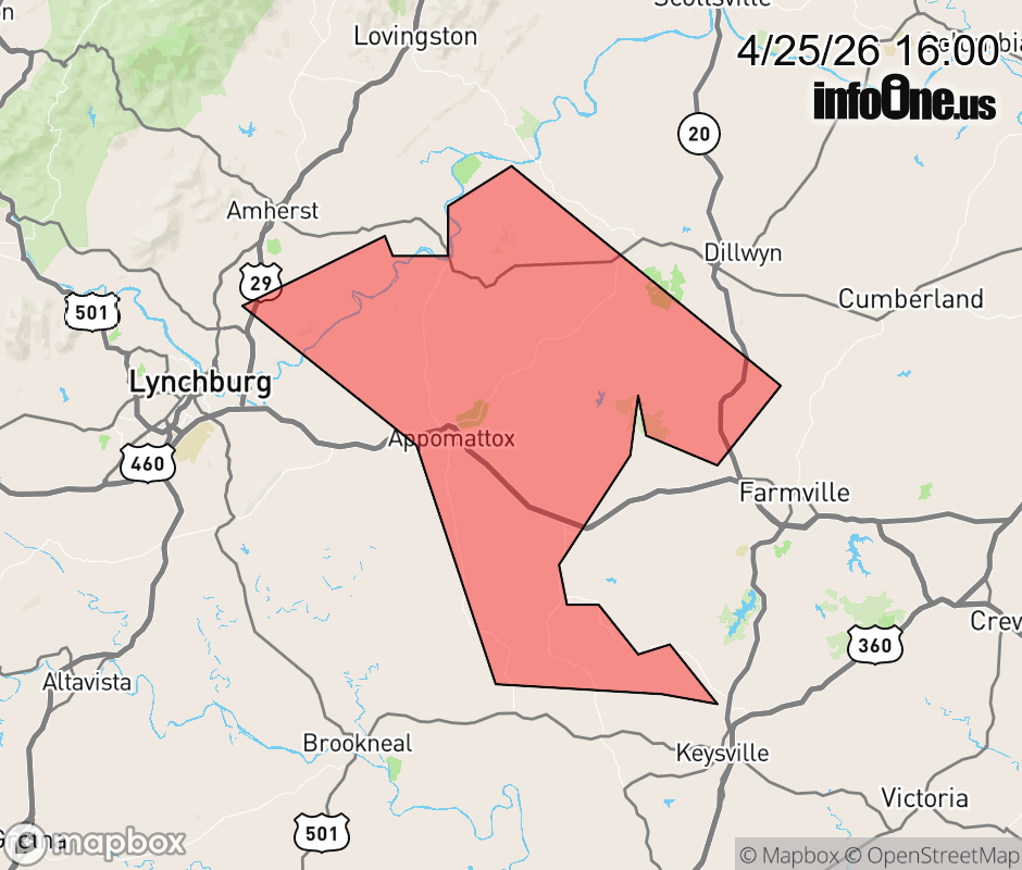Canceled 4/25/26 4:30 PM Special Weather Statement issued April 25 at 3:59PM EDT by NWS Blacksburg VA At 358 PM EDT, Doppler radar was tracking strong thunderstorms along a line extending from near Stonewall to Appomattox to near Madisonville. Movement was east at 25 mph. HAZARD...Wind gusts up to 40 mph and heavy rain. SOURCE...Radar indicated. IMPACT...Gusty winds could knock down tree limbs and blow around unsecured objects. Locations impacted include... Appomattox... Red House... Bent Creek... Pamplin City... Madisonville... Cullen... and Appomattox National Historic Park. ![]() |