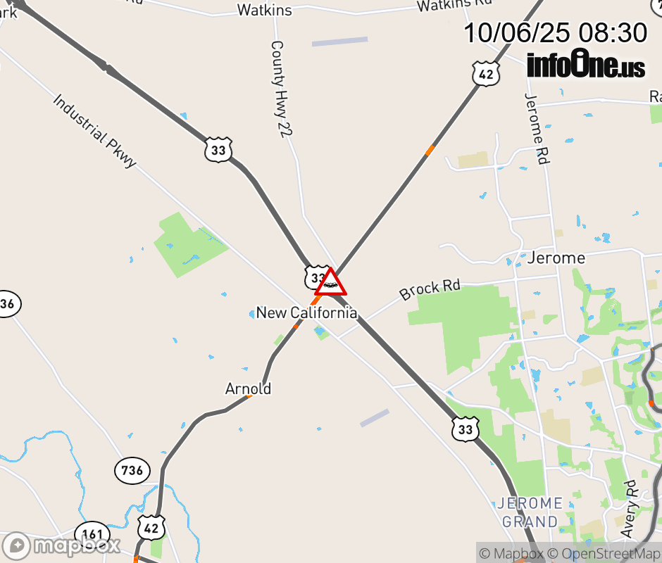 Expect lane closures on US-42 North at Watkins California Rd, due to a crash. Updated: Mon 10/6/25 8:30 AM EDT ![]() Updated: Mon 10/6/25 8:30 AM EDT |