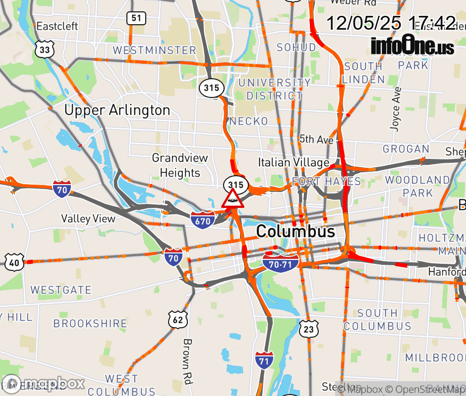 The right lane is blocked on SR-315 South at I-670 West, due to a crash. Updated: Fri 12/5/25 5:42 PM EST ![]() Updated: Fri 12/5/25 5:42 PM EST |