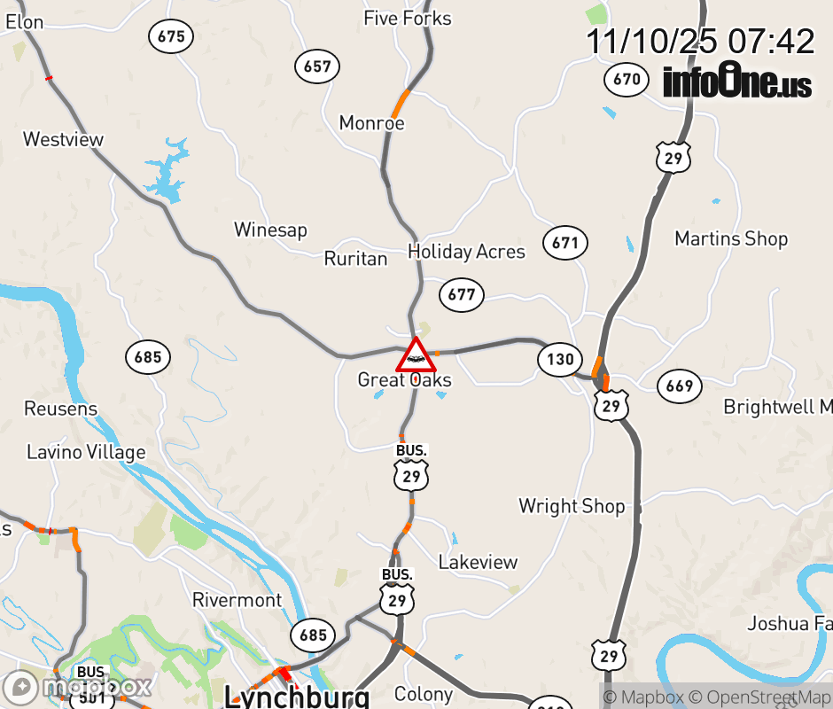 On VA-130 in the County of Amherst, in the vicinity of S Amherst Hwy; BUS US-29N/S (5 Lynchburg/Amherst/Campbell), BUS US-29N/S;AMELON RD, motorists can expect delays due to a vehicle crash. The west left shoulder and left lane are closed. ![]() |