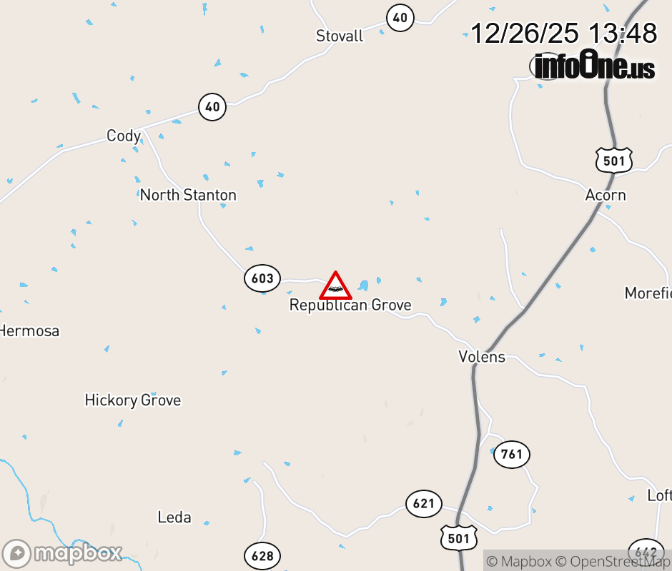 On Rt. 603 in the County of Halifax, in the vicinity of Tobacco Rd; Rt. 647N/S (Halifax County), motorists can expect delays due to a vehicle crash. All east lanes are closed. All west lanes are closed.