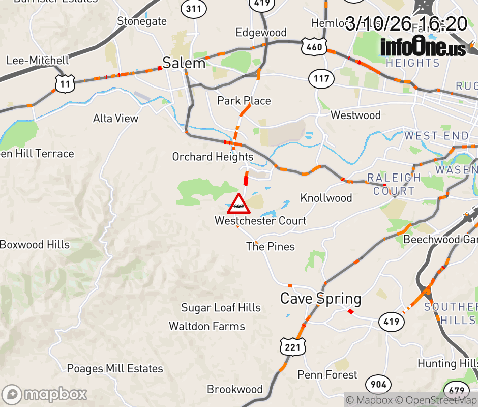 On VA-419 North in the County of Roanoke, in the vicinity of Hidden Valley School Rd; Valley Dr; Rt. 9360E/W (Roanoke County); Rt. 1442N/S (Roanoke County), motorists can expect delays due to a vehicle crash. Lane closures exist. ![]() |
