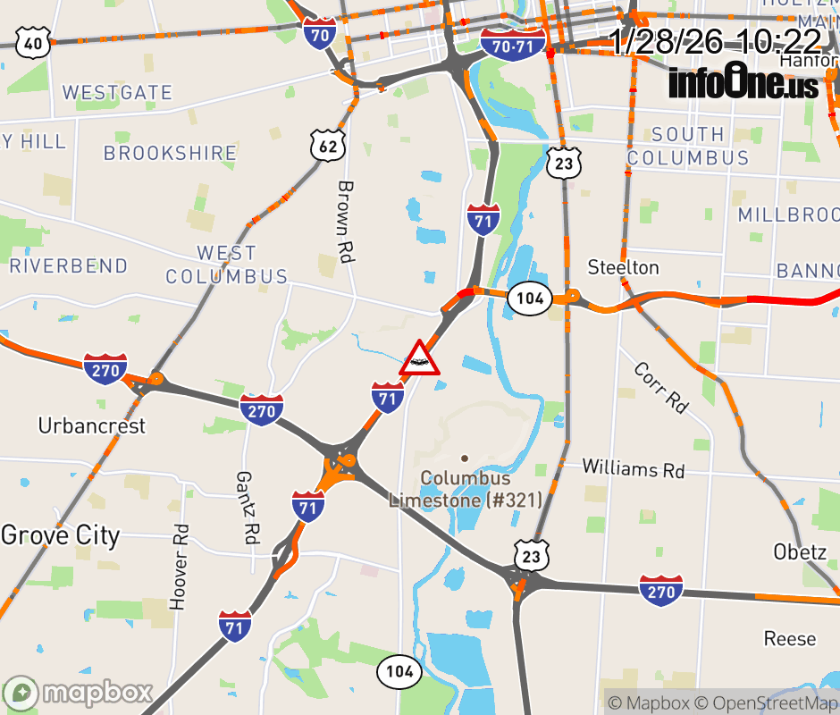 The right lane is blocked on I-71 South beyond SR-104/Frank Rd, due to a crash. ![]() |
