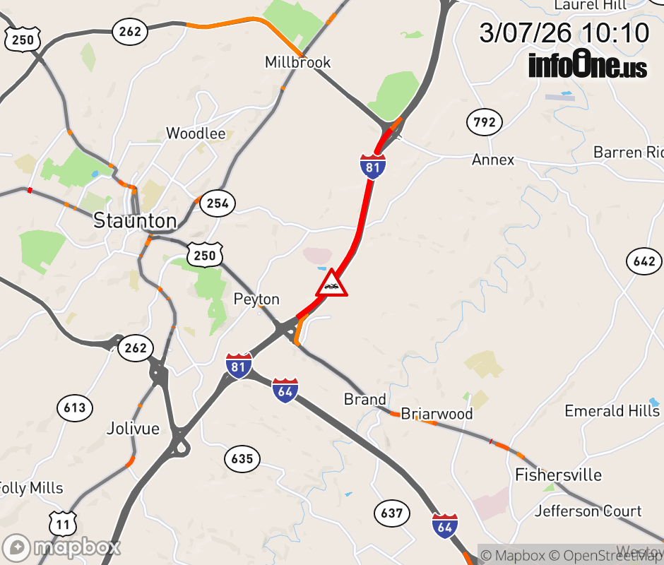 On I-81 South at mile marker 223.5 in the County of Augusta, motorists can expect delays due to a disabled vehicle. Traffic backups are approximately 2.0 miles. Updated: Sat 3/7/26 10:10 AM EST ![]() Updated: Sat 3/7/26 10:10 AM EST |
