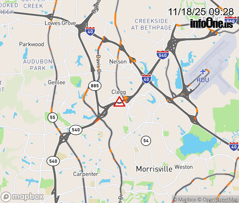 The right ramp lane is closed at Exit 67 (Davis Drive). Updated: Tue 11/18/25 9:28 AM EST ![]() Updated: Tue 11/18/25 9:28 AM EST |