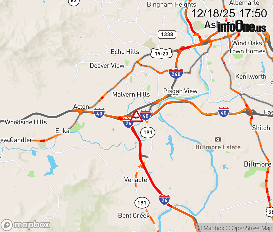 The left lanes are closed before Exit 46A, I-26 East. Updated: Thu 12/18/25 5:50 PM EST ![]() Updated: Thu 12/18/25 5:50 PM EST |